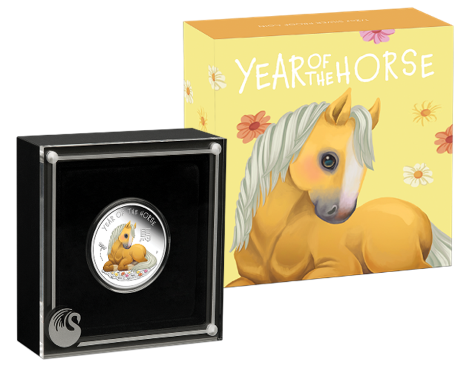 The coin’s reverse side portrays a happy pony resting on grass adorned with dainty flowers and a dragonfly fluttering above. The words “YEAR OF THE HORSE,” the Chinese character for horse, and the letter “P” for the Perth Mint are also incorporated into the design. Crafted with an exquisite proof finish, the mirror-like luster of the coin beautifully accentuates the playful theme and the intricate craftsmanship of the design.