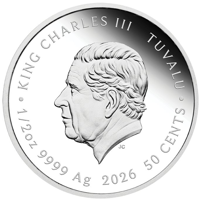 The coin has a diameter of 32.6 mm and a thickness of 2.9 mm. The obverse bears an effigy of His Majesty King Charles III, the Head of the British Commonwealth. The king’s name (KING CHARLES III), issuing country (TUVALU), denomination (50 CENTS), weight (1/2 oz), purity (9999Ag), and year (2026) are engraved on the outer ring. The cute and energetic pony symbolizes the vitality and hope of life, carrying blessings for a bright future.